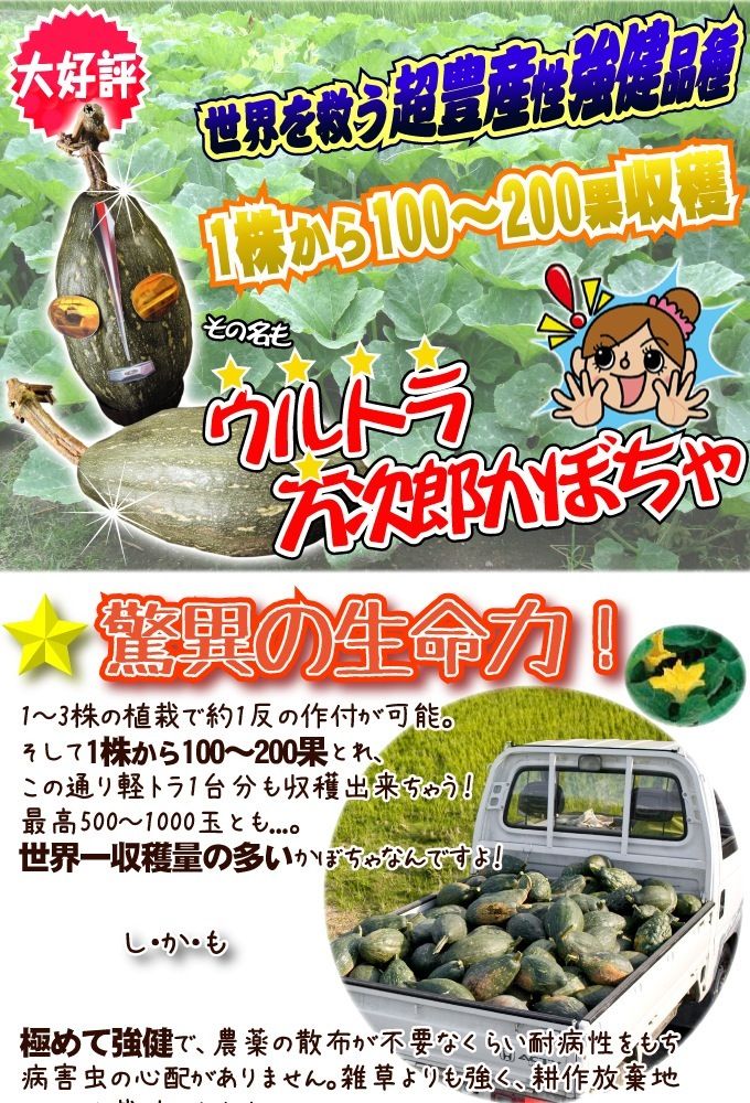 近所の空き地なんかに撒くと、たった半年で地面の奥深くまでカボチャの根が張りまくって重機でほじくり返すのさえ困難になるよ