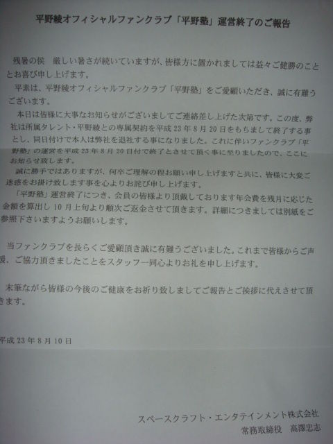 同日付けで本人は弊社を退社する事になりました。これに伴いファンクラブ「平野塾」の運営を