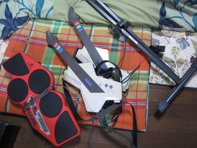 ギターはベルト部分が壊れてて、ドラムはフットペダルが行方不明になってた