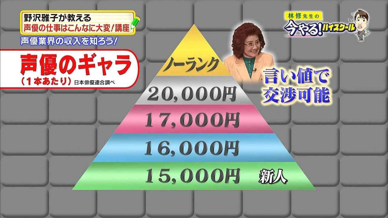 ベテラン声優のギャラはテレビの中堅司会者と同じぐらいのギャラだぞ、大体一回50万。新人は安いって言われてるけどアフレコの収録時間ってだいたい3〜4時間だし、たったそれだけの労働で1万5000円って結構わりのいい仕事だと思わんか?