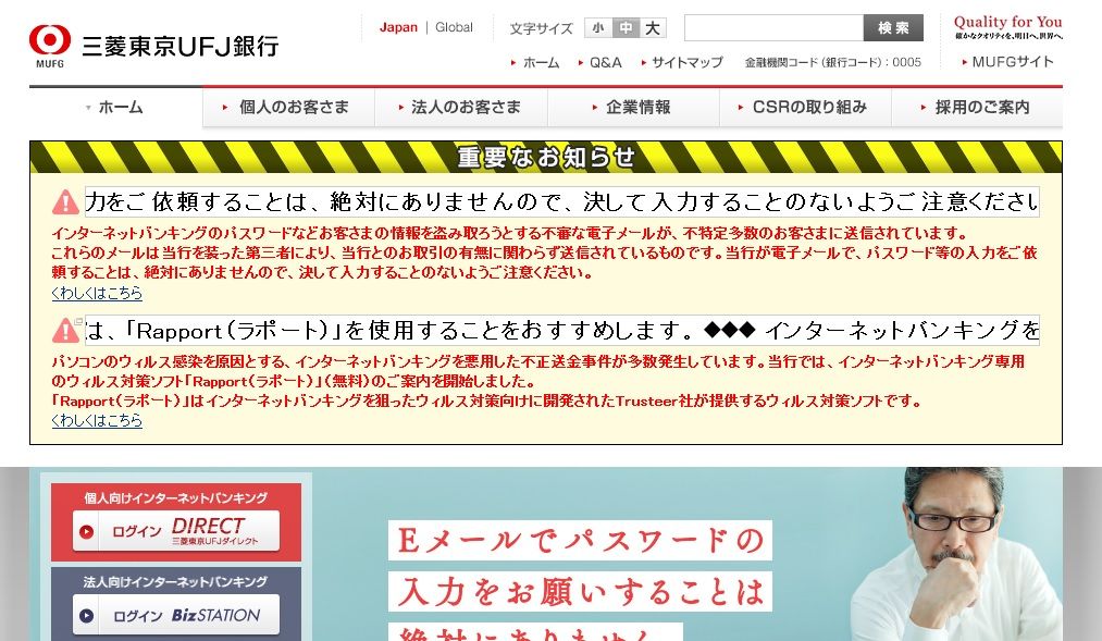 三菱東京UFJ銀行のトップページにデカデカと貼られた緊急警告文が下品だと、Web業界の人が嘆かれております。ティッカー(マーキー)という昔ながらのホームページの手法も取り入れられているのも、それはそれは評判が悪いわけです。