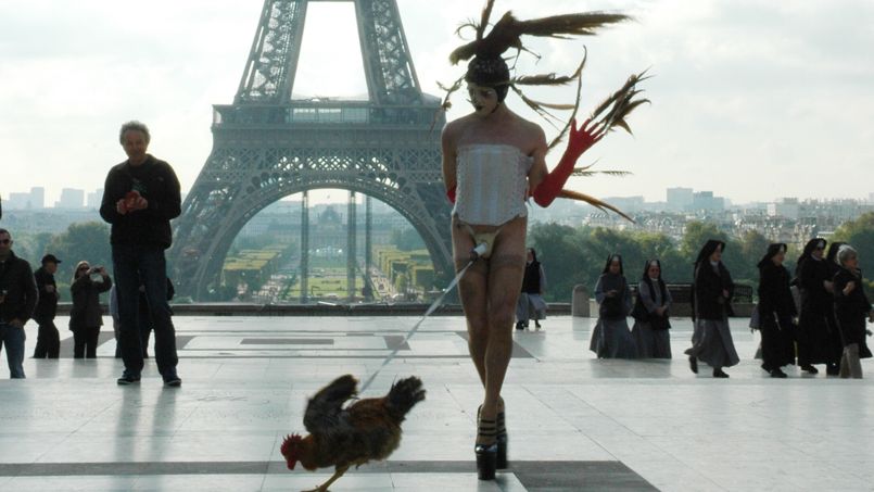 パフォーマンス・アーティストとして活動してきた、スティーヴン・コーエンという南アフリカ国籍の白人男性。誰にも真似できない、そして誰のパクリでもない斬新な芸術表現を模索してきた彼は昨年9月、エッフェル塔の観光客も多数いる「トロカデロ広場」でとんでもないパフォーマンスを繰り広げ、公然わいせつの罪で逮捕された。こちらの画像は5日、『AFP news agency』さんが”“Artist Steven Cohen convicted for rooster-penis dance”というタイトルでYouTubeに投稿した動画のスクリーンショット。羽飾りを効かせたコルセットスタイルと超ハイヒールでエッフェル塔の前に繰り出し、自分のペ○スに紐をつけて雄鶏を散歩させているところである。
