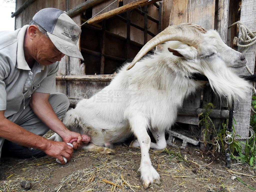 獣医師の山崎博道さんにお乳を搾られる雄ヤギの「ネギ」