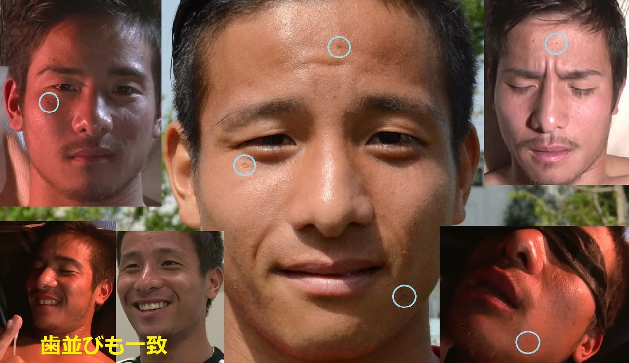 ホモビデオの方 よく見たら眉毛を描いてるな〜。タレ眉→つり眉、胸に貼ったシールタトゥーの偽造及びその他の細かな特徴の一致…馬鹿だなあ