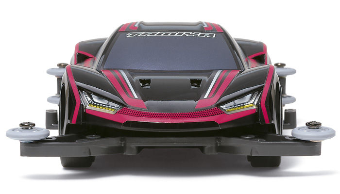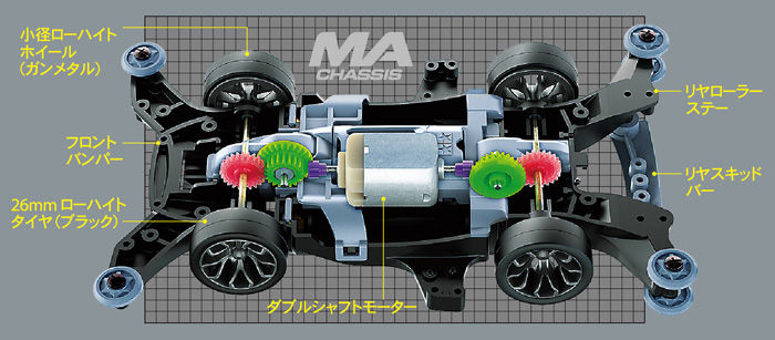 メインカラーは黒でまとめられており、ピンクのラインを引くカラーリングもおもしろい。MAシャーシは中央にモーターを配置し、前後のギアでシャフトを動かす設計になっている。空力も考えられており、安定感のあるシャーシとなっている。