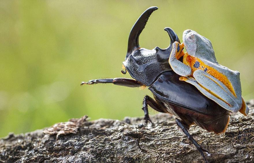 【画像】カブトムシを乗りこなす器用なカエルが見つかる