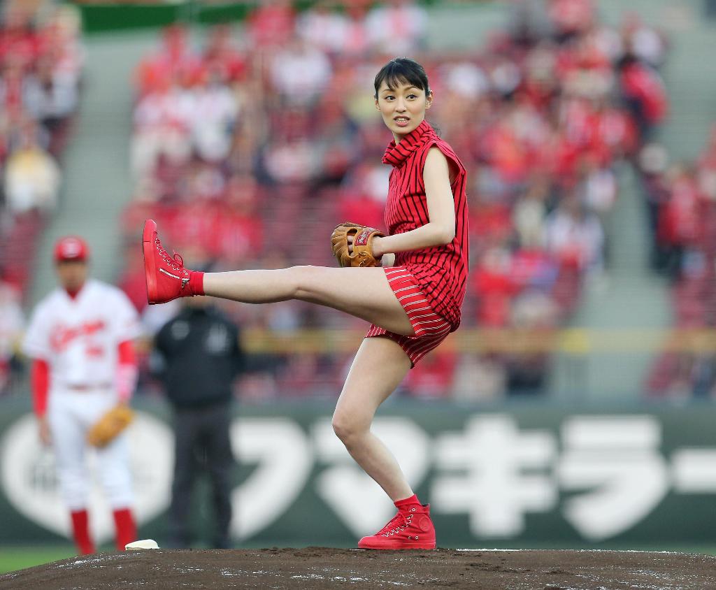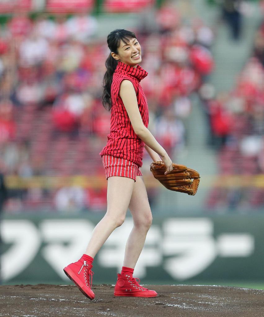 栗山千明さん(30歳)が太もも丸出しショートパンツで始球式!!