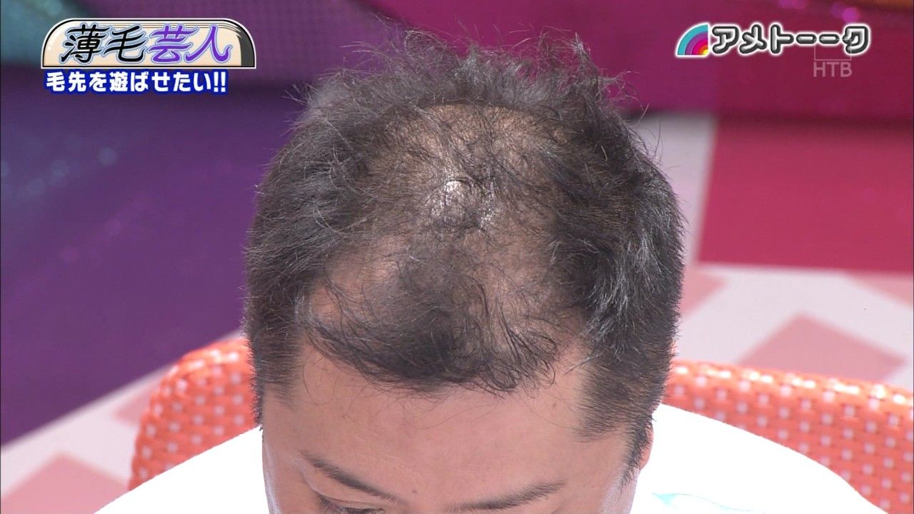 横の髪乗っけたり、えらい細ーい死にかけの頭頂部の髪をダラダラ伸ばしたり。