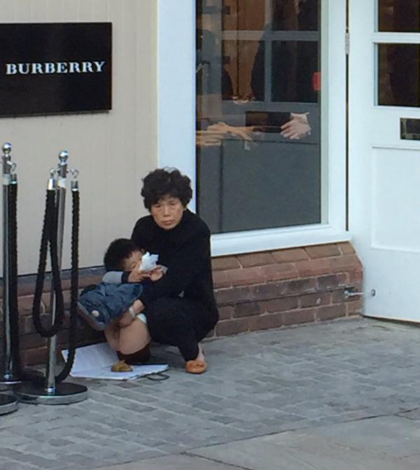 世界各国での中国人の“爆買い”が話題となっている。英ロンドンの郊外にある「ビスター・ビレッジ・アウトレット・ショッピングセンター」も中国からの観光客が多く訪れているようだ。このアウトレットモールにある「バーバリー」の店舗前で、シートを敷き子供に排便させている女性がいた。その衝撃的な行為を撮影したツイッターユーザー、Matt Kellyさん(@track_taxi)が今月2日、この写真を公開するとネット上は騒然となった。
