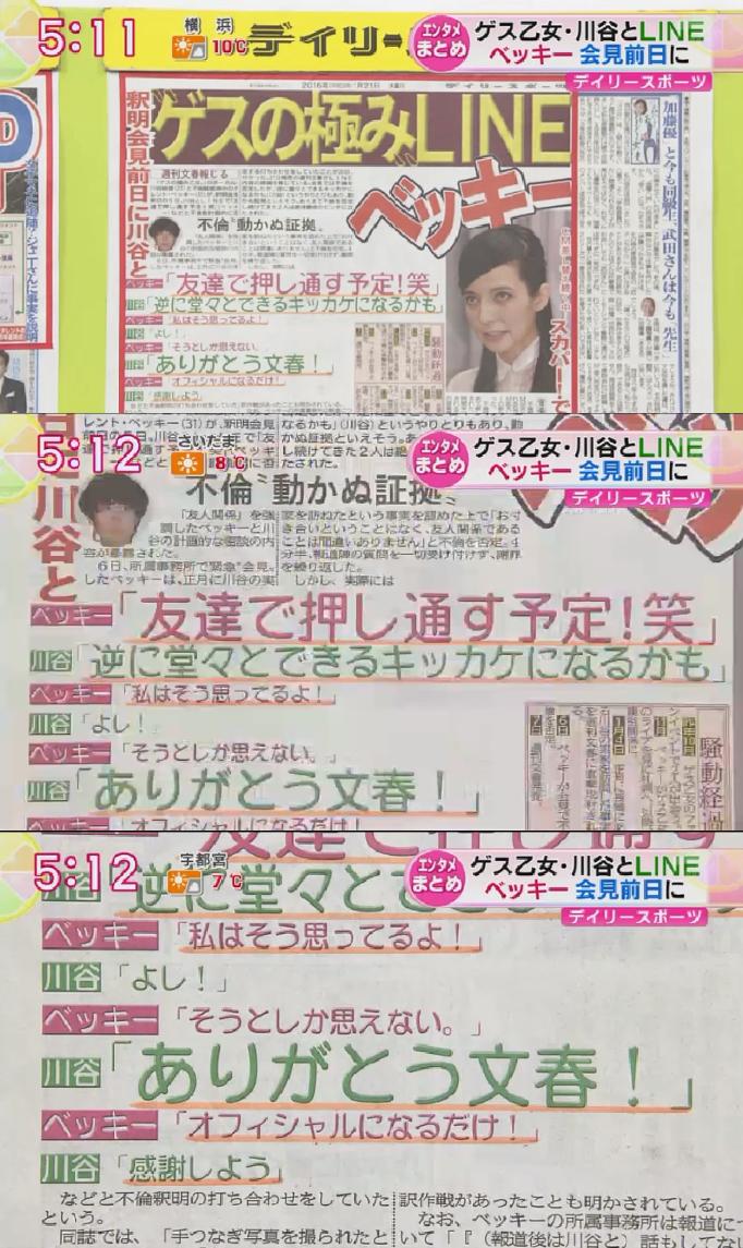 この前はゲス側から流出して、今回はベッキー側?そんな簡単に流出できるの?二人の古いスマホでスクショしたとしても、それをどうやって手に入れるんだろう。メールで送って履歴消せばいいのかな…。腑に落ちない。不倫してるのは事実だとしても、ラインは偽物な気がする。名無し at 2016年01月22日 15:31 ID:GNPAcZJw0