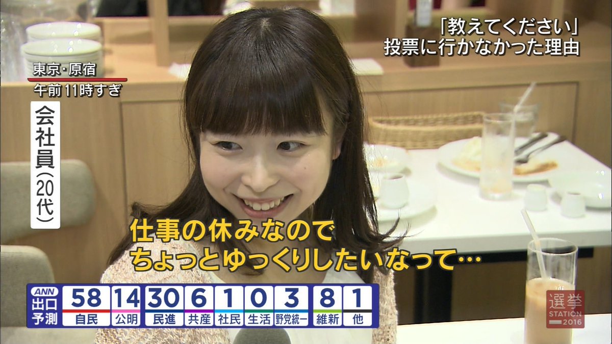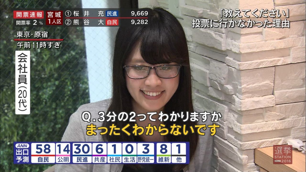 選挙行かずにネトゲ三昧で外でインタビューすらされないキモオタだってうようよいんだろうなとは思うもみあげる名無し at 2016年07月11日 22:49 ID:qiWdsFvu0