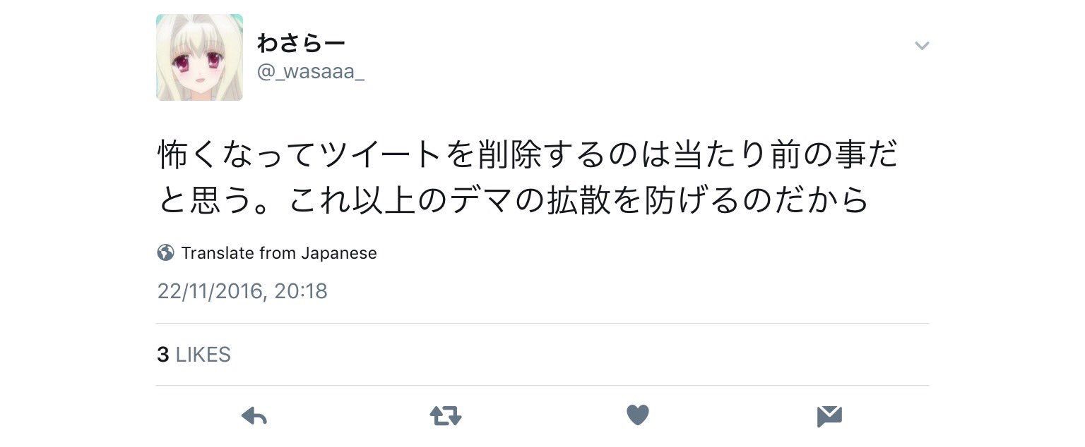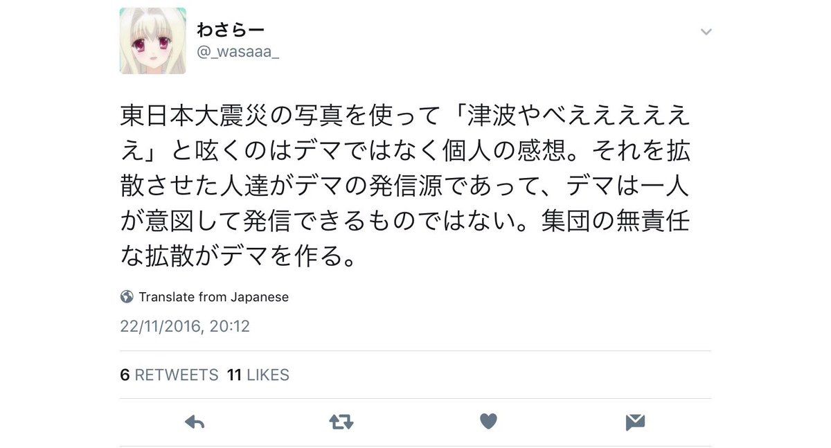 これ許したら、次の震災の時に同じようなデマを流す奴が出てきちゃうからね。逮捕しておかないと。名無し at 2016年11月23日 09:56 ID:zB7NdXaj0
