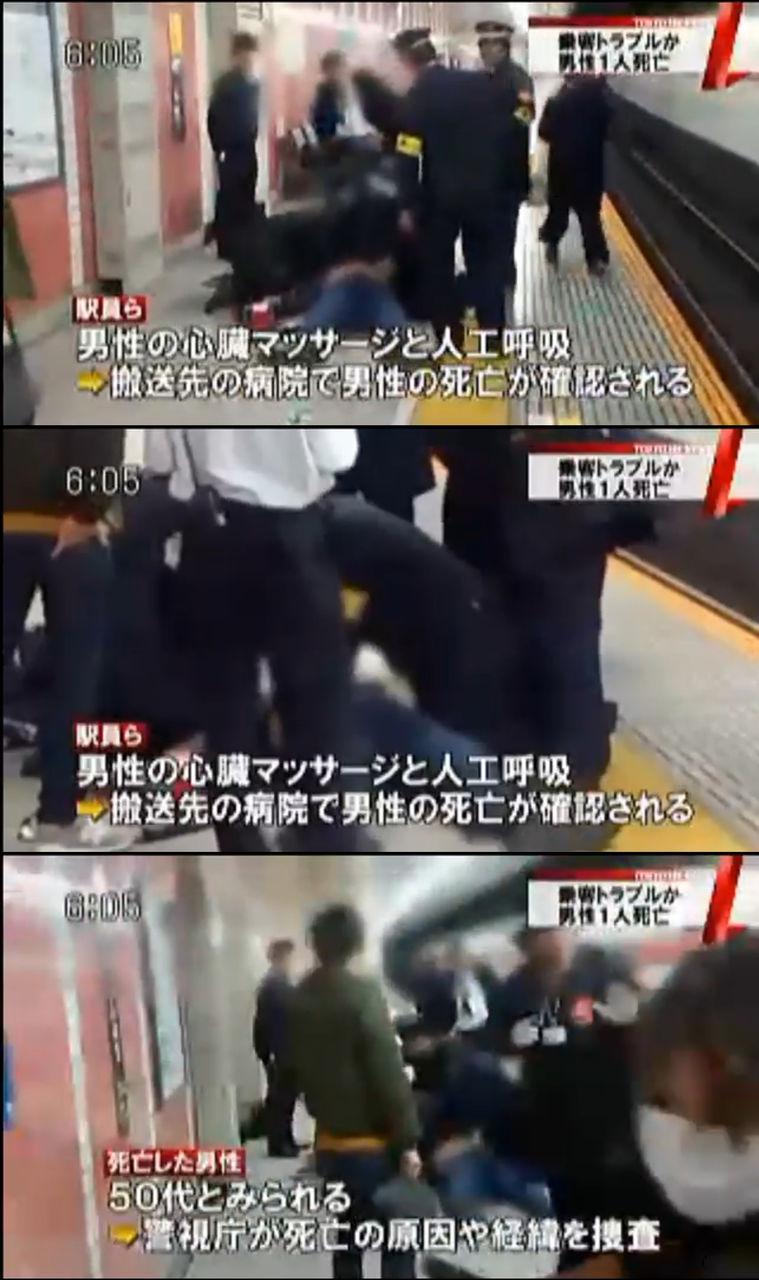 面白半分でこのおっさんを晒した結果、勝手に写真撮る奴が増えて、このおっさんも切れたんだろ。そんで、盗撮を咎めたら、このおっさんが取り押さえられて死亡。