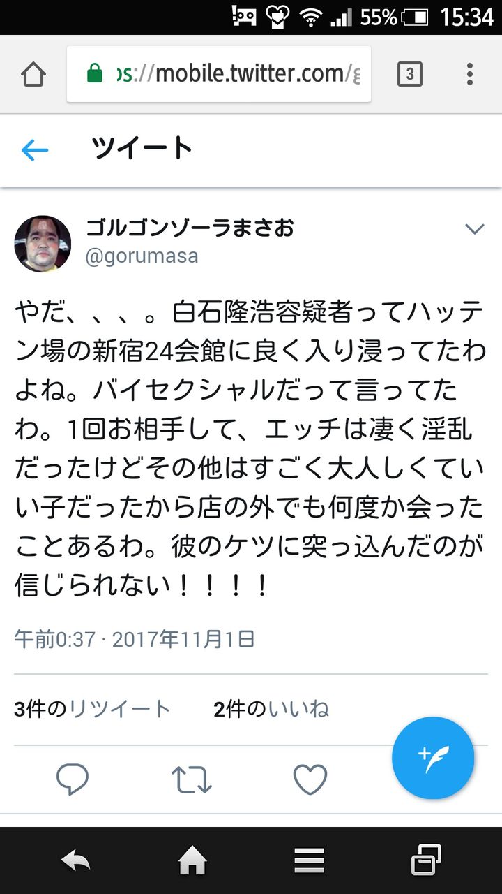 【速報】白石容疑者、ゴルゴンゾーラまさお氏にハッテン場で掘られていた
