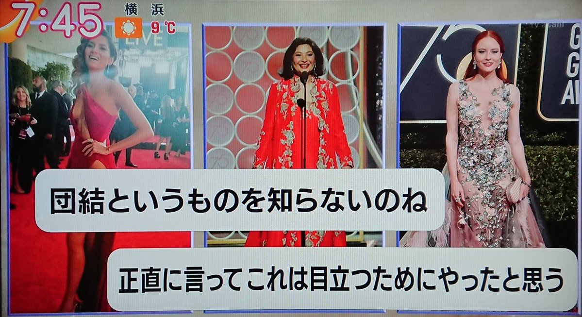 まあ、セクハラ抗議みたいなクサイ演出をわざわざこんな舞台でやるのもどうかと思うが、黒のドレスコードで揃えたのは女優だけやなくて男性俳優もやで