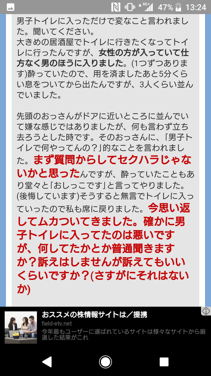 女が男子トイレに入ってきた段階でそのおっちゃんの方がセクハラの被害者だよなもみあげる名無し at 2018年05月06日 08:37 ID:6x.Xvg.00 -