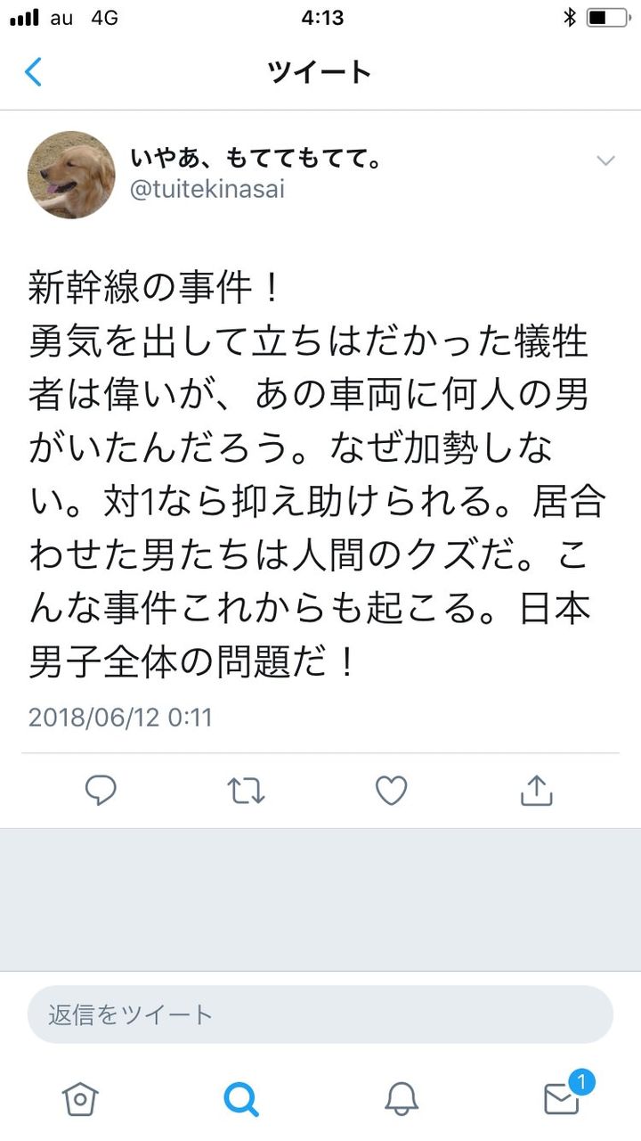 旦那や息子が居合わせたとしたら、「なぜ助けなかった」とは思わない。at 2018年06月13日 09:30 ID:zZP5JX810 -
