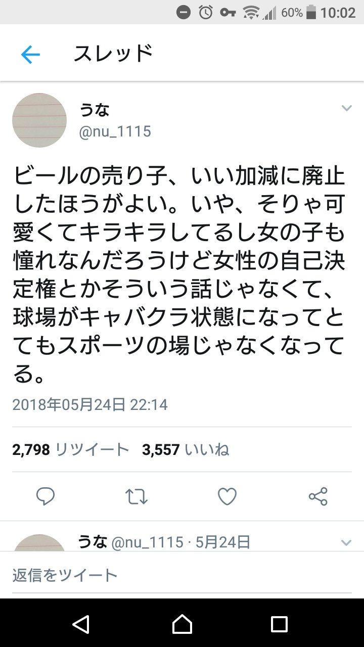 売り子がいることで、キャバクラでするような会話を球場でもしてしまう気持ち悪いのが出てくる…ということなのだろうが、下品な人間は割とどこにでも出没してるね、売り子の有無にかかわらず。
