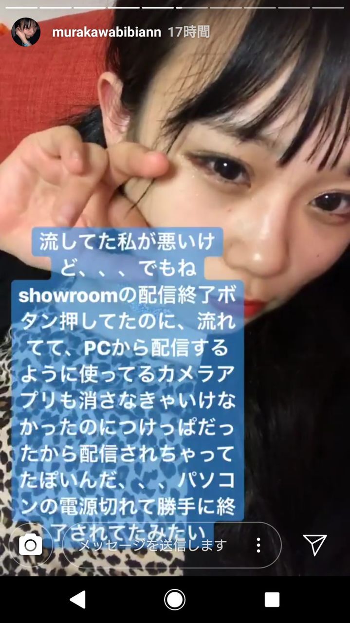 『HKT48』のメンバー村川緋杏さんが『SHOWROOM』で配信後に接続を切り忘れ、配信状態のままだったというトラブルが起きた。