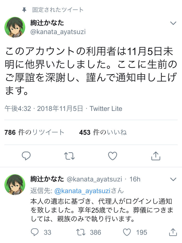 本当に死んで本物の訃報ツイートされるけど誰にも相手にされないって展開にならんかなもみあげる名無し at 2018年11月08日 20:27 ID:ZJNXsm0d0