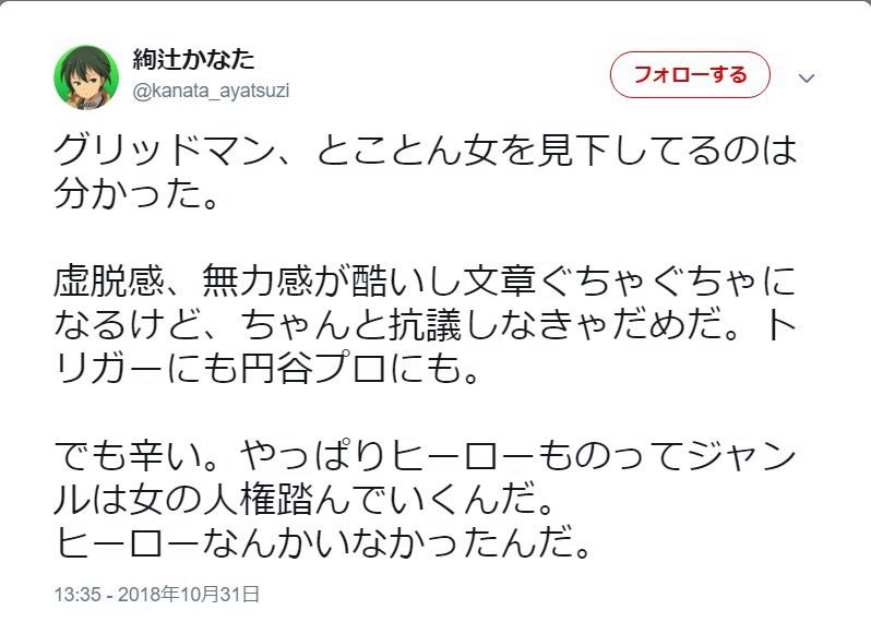 ワイグリッドマン再放送世代。特撮版も今やってるアニメ版も大好きだからこういう気持ち悪い輩の自己顕示欲を満たす為の道具にされるのが許せないっす…かんたろう at 2018年11月08日 17:11 ID:34bQv9.20