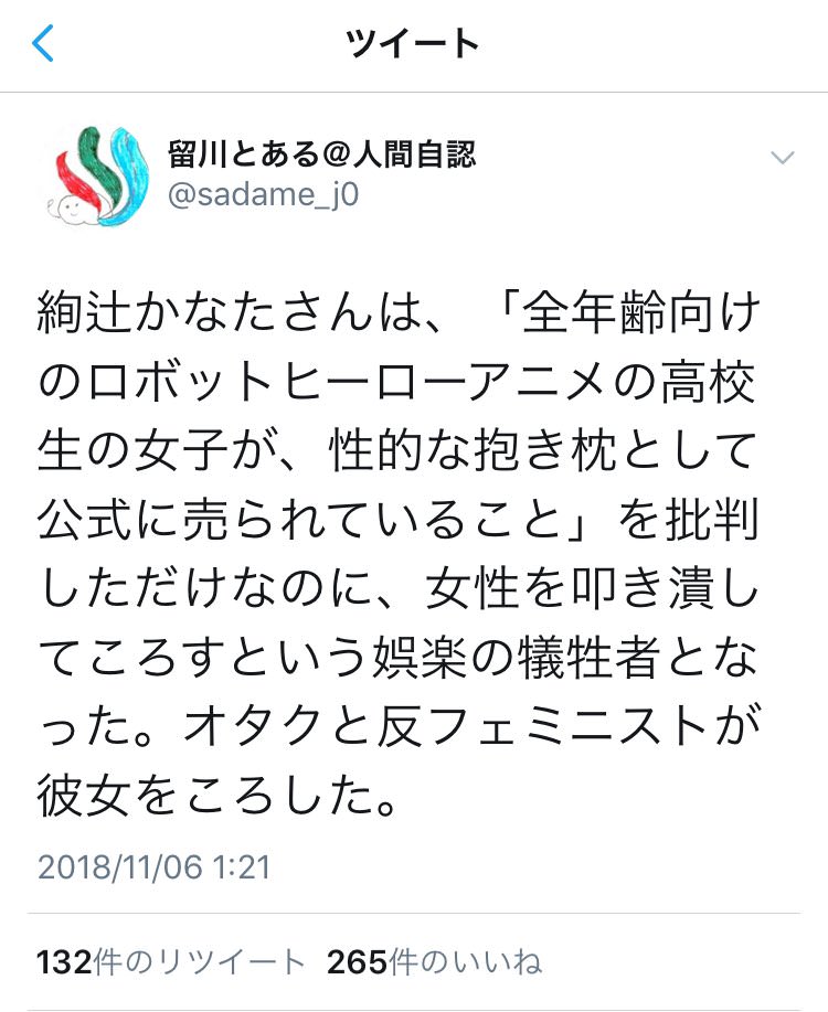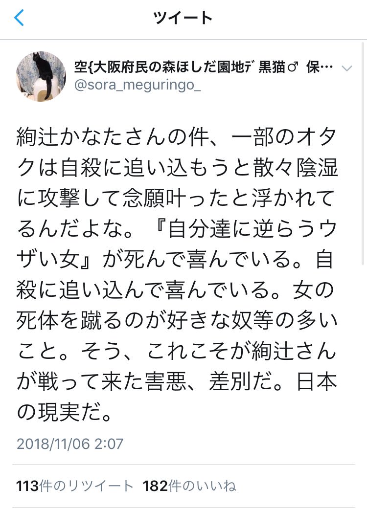 だいたい「亡くなった」という趣旨のツイートにも何のソースもないし超胡散臭いのに、それを間に受けて「オタクと反フェミニストが一人の女性を殺した」とかツイートしてるやつってろくな教育受けてないと思う。一体死んだ人間がどうやってツイートすんだよ。親がツイートしたとでも言うのか?だいたい自分の親が子供が死んだこといちいちツイッターで報告しようと思うかね?フェミカスは人類の失敗作 at 2018年11月09日 07:42 ID:9AR.2s2G0 -