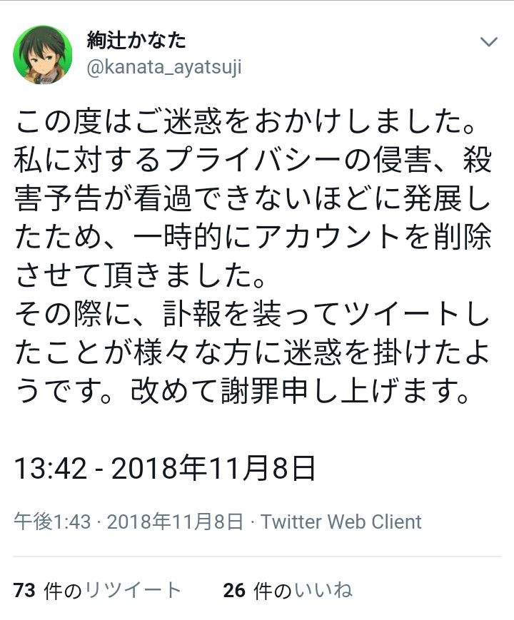 殺害予告されたといつ大嘘。どこまで嘘を重ねるんや?