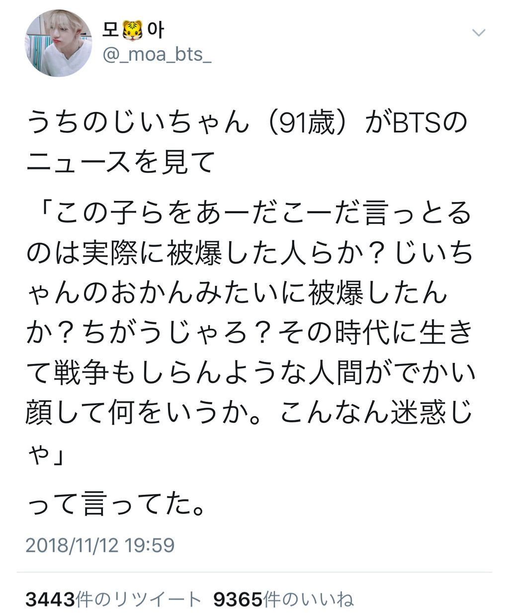 BTSを擁護するためにあの世から甦った孫思いのじじいやぞ. at 2018年11月13日 12:26 ID:Ml.l14q40