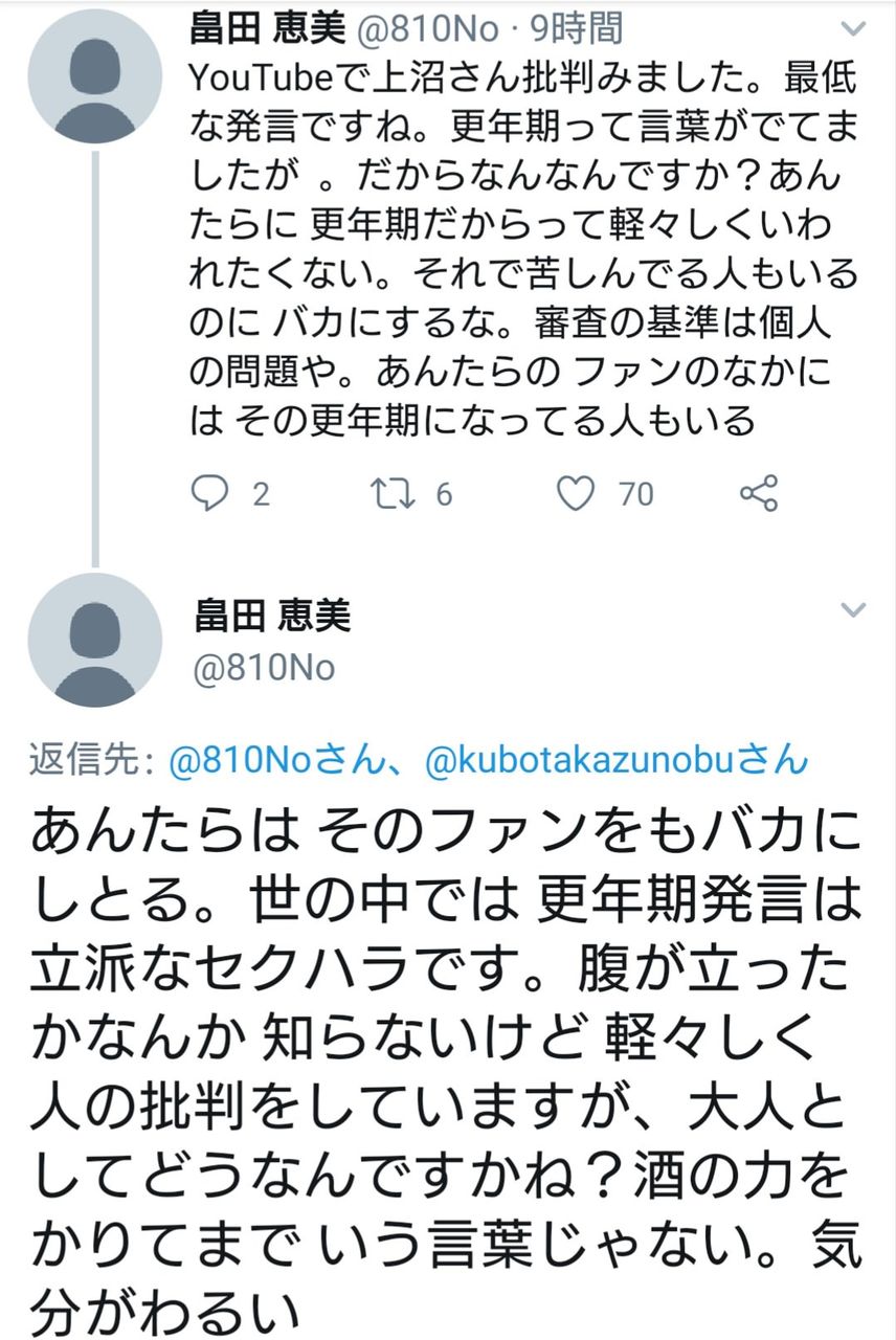 上沼、今期で審査員辞めると言ってるし、実績残してきた関西の重鎮にセクハラモラハラ紛いの動画配信するとか頭おかしすぎるわ