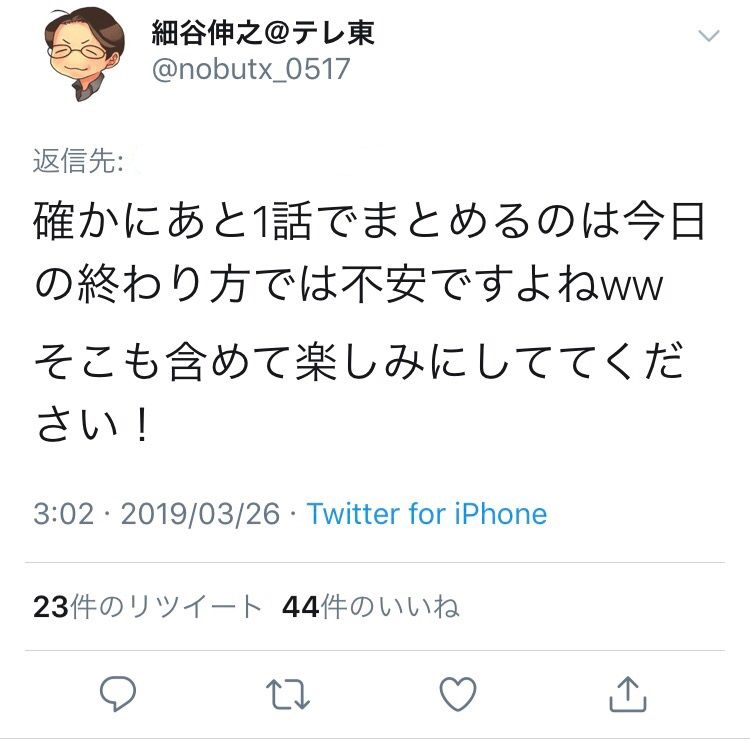 こちとら毎週楽しみに観てるってのに名無し at 2019年03月27日 18:18 ID:fa5fg3Ng0 -
