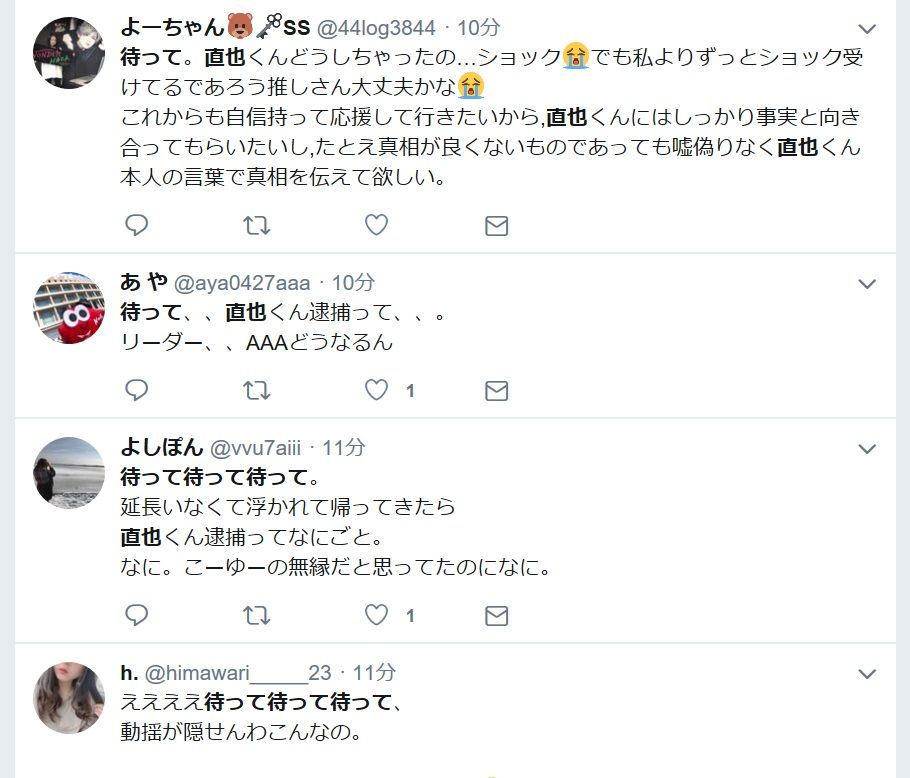 嵐の活動停止の時とかも「待って」が凄かったし、男女間の語彙(文章構成)を研究したら面白そう。あ at 2019年04月21日 00:32 ID:hGo5jPHy0