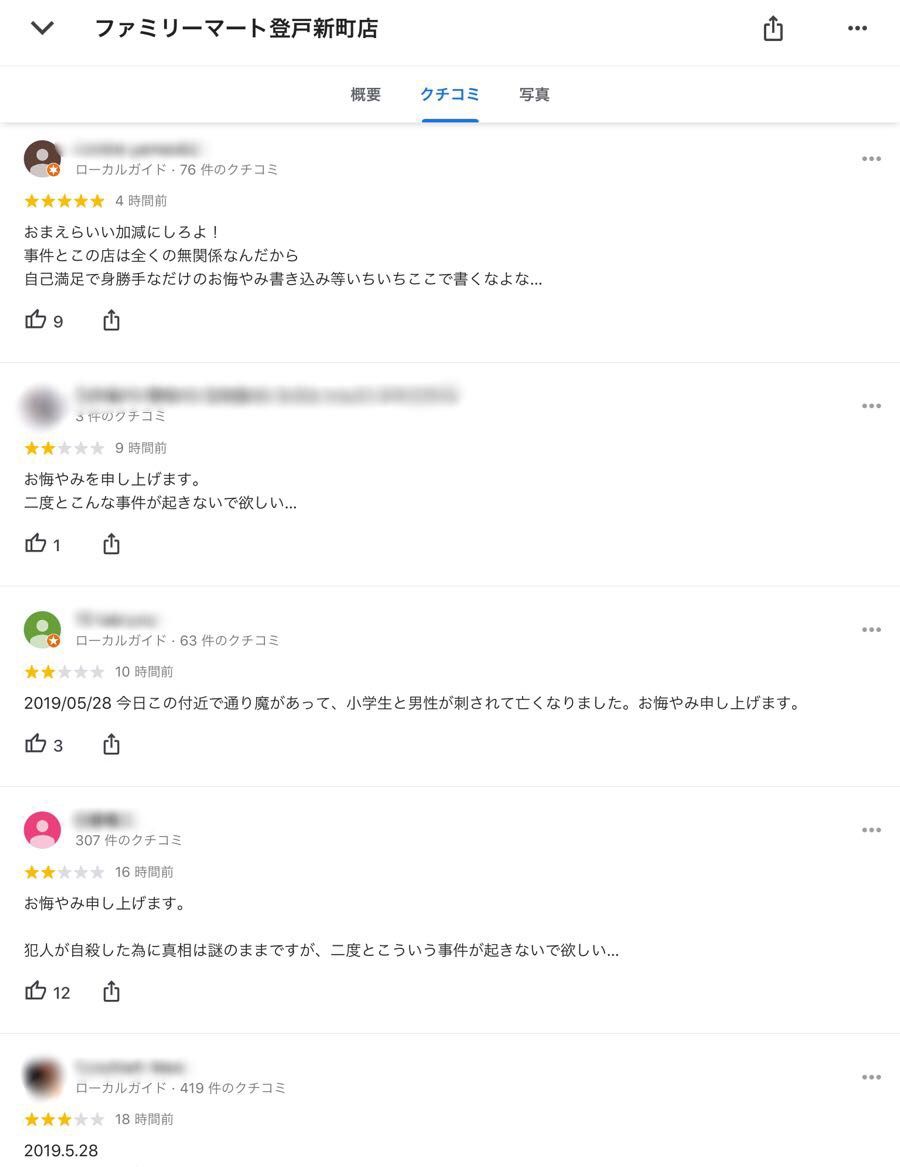 【悲報】献花民によって現場向かいのファミマのレビューが荒らされる