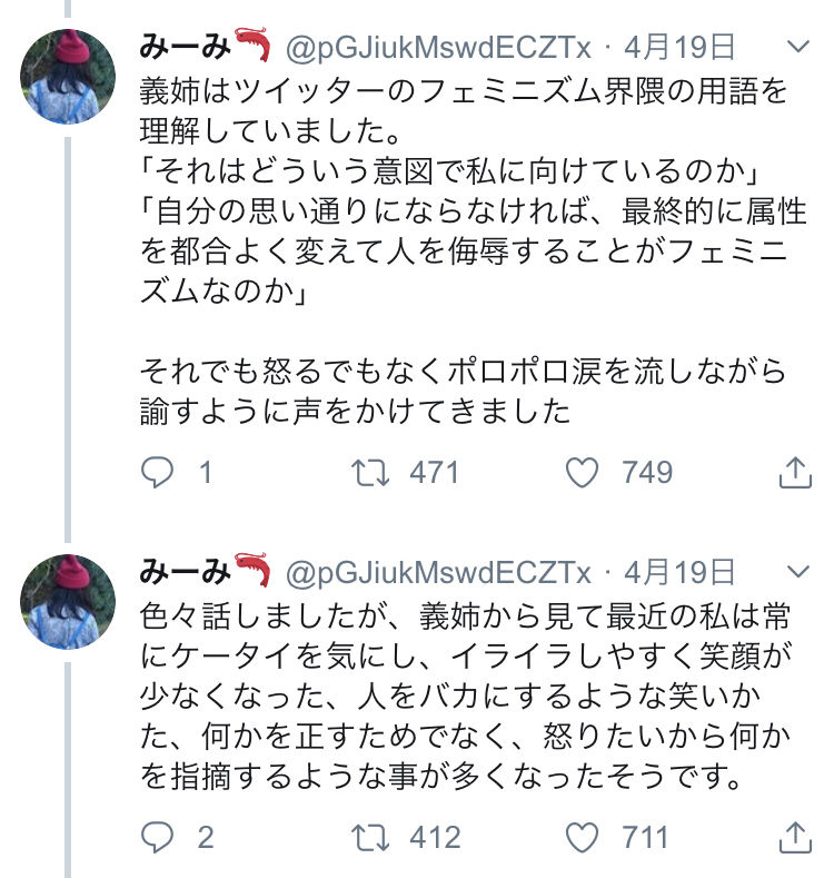 一度フェミ発言して、味方が増えた感じがして、それが心地よくてフェミやってたが