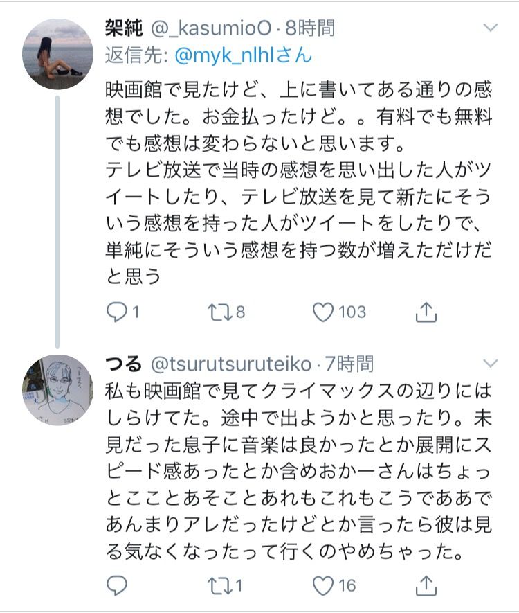 君の名は。が劇場で公開された時はここまで「気持ち悪い」だの誹謗中傷暴言大合唱ではなかった。結局、金払わない人がタダで見た挙句「気持ち悪い……」って言ってるのよ。そう考えると、ホントこういう人達に気を遣うのってしょーもないよね。お金は払わないのに、文句は言う