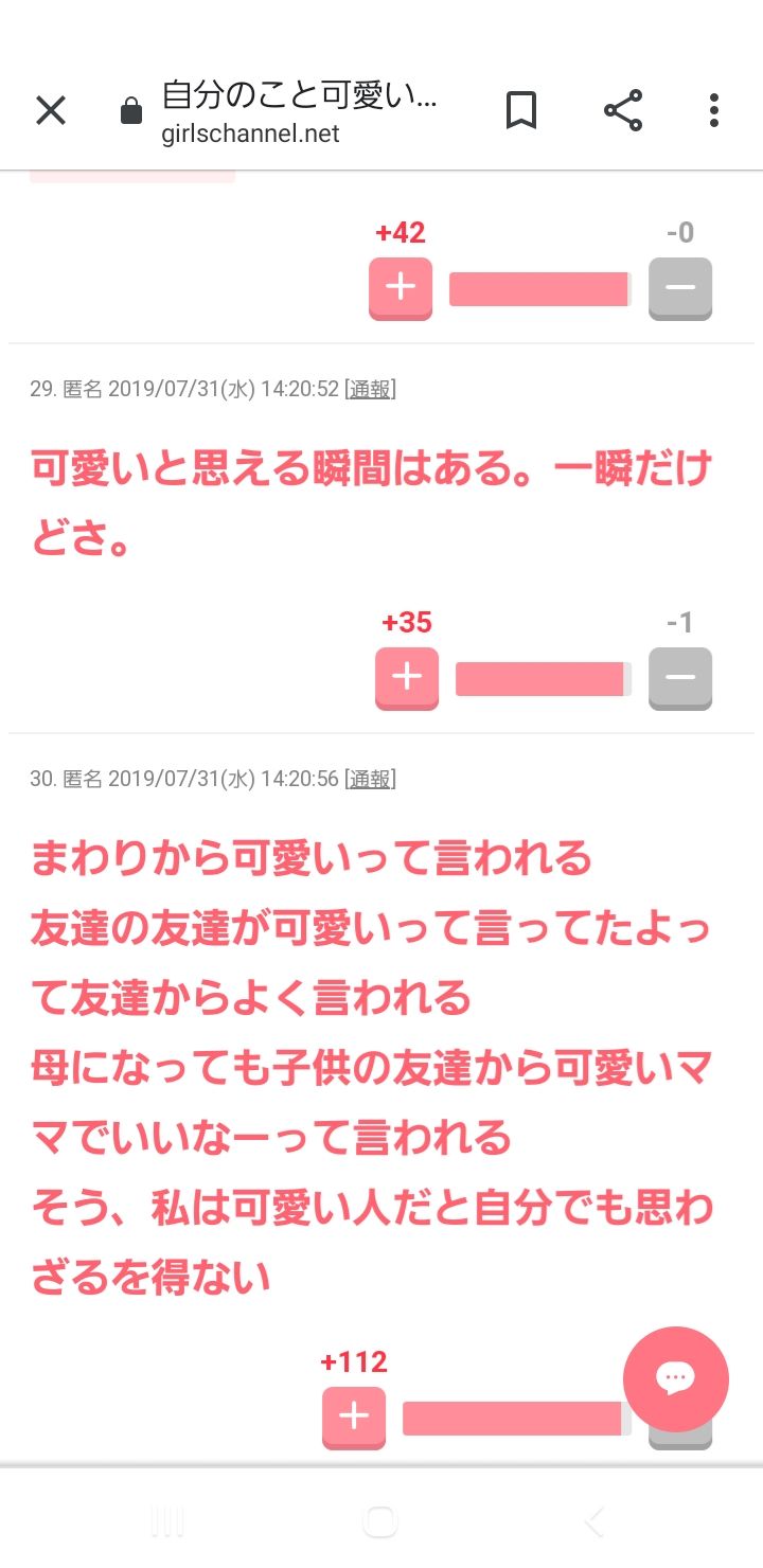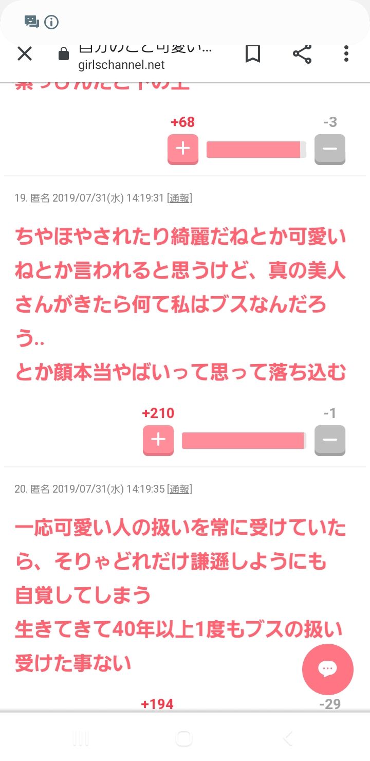ガルちゃん民を叩いてやろうかと思ったが、ふと冷静になって思い返すと自分も過去に、若手の役者やアイドルに「別にイケメンじゃ(可愛く)ない」とかなんとか、ネットに書き込んでたことがあった。だから俺はこいつらを叩けない。最低な男 at 2019年09月01日 12:25 ID:NcZUMUKW0
