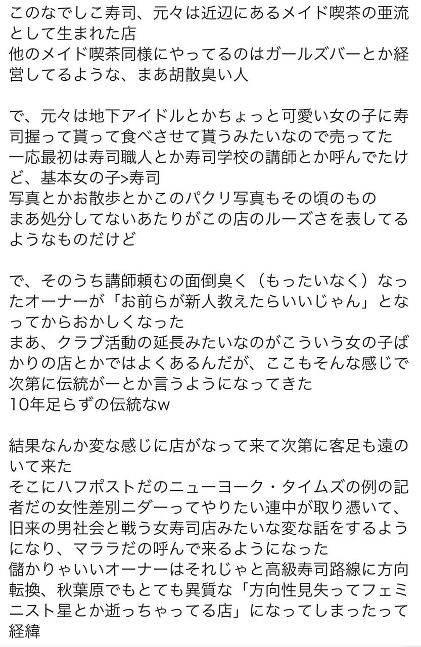 男女関係なくよしとされないこと(不衛生な営業)を指摘される→「女性差別だ!」と騒ぎ指摘者を店舗ツイッターで攻撃する→騒ぎが大きくなり不衛生だけでなく風俗のような裏営業や他店画像パクリが発覚する→店舗は突如だんまりを決め込む→燃えに燃え大炎上の様相を呈すツイッターリプ欄→2日置いてやっと出てきた謝罪文が「前の体制がやったことで私には無関係です」