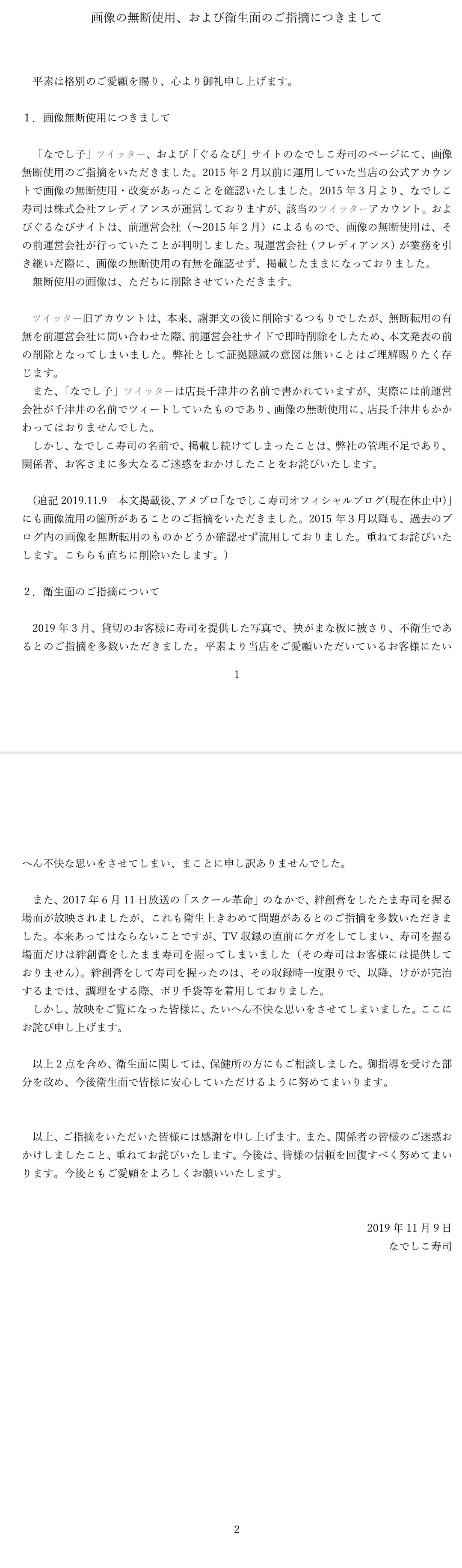 「なでし子」ツイッター、および「ぐるなび」サイトのなでしこ寿司のページにて、画像無断使用のご指摘をいただきました。