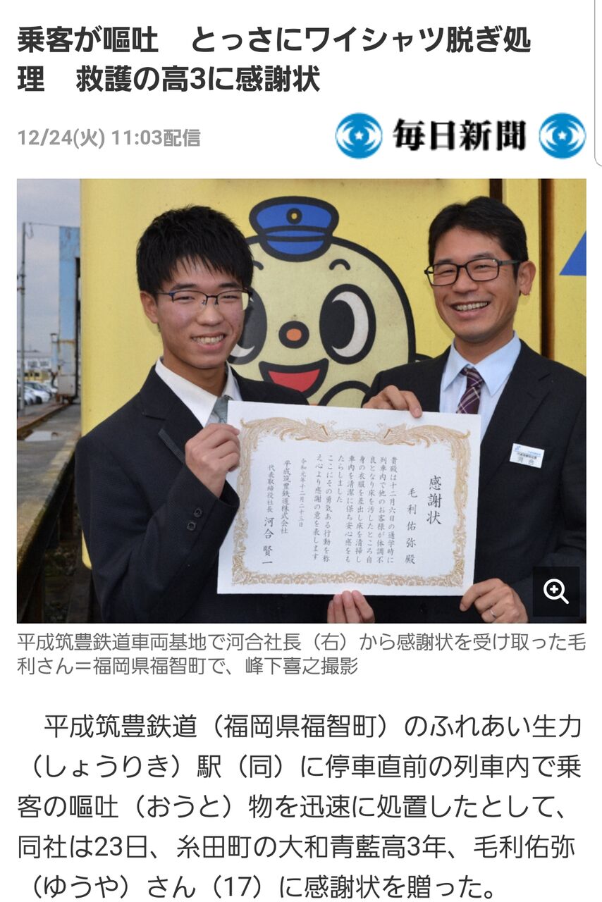 平成筑豊鉄道(福岡県福智町)のふれあい生力(しょうりき)駅(同)に停車直前の列車内で乗客の嘔吐(おうと)物を迅速に処置したとして、同社は23日、糸田町の大和青藍高3年、毛利佑弥(ゆうや)さん(17)に感謝状を贈った。