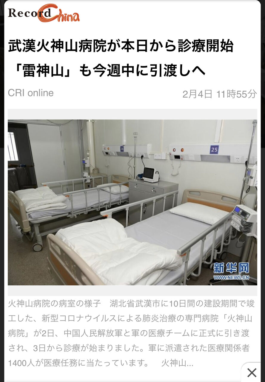 病院じゃなくて隔離施設。強制収容所だよ。もみあげる名無し at 2020年02月06日 09:30 ID:jQORmV090