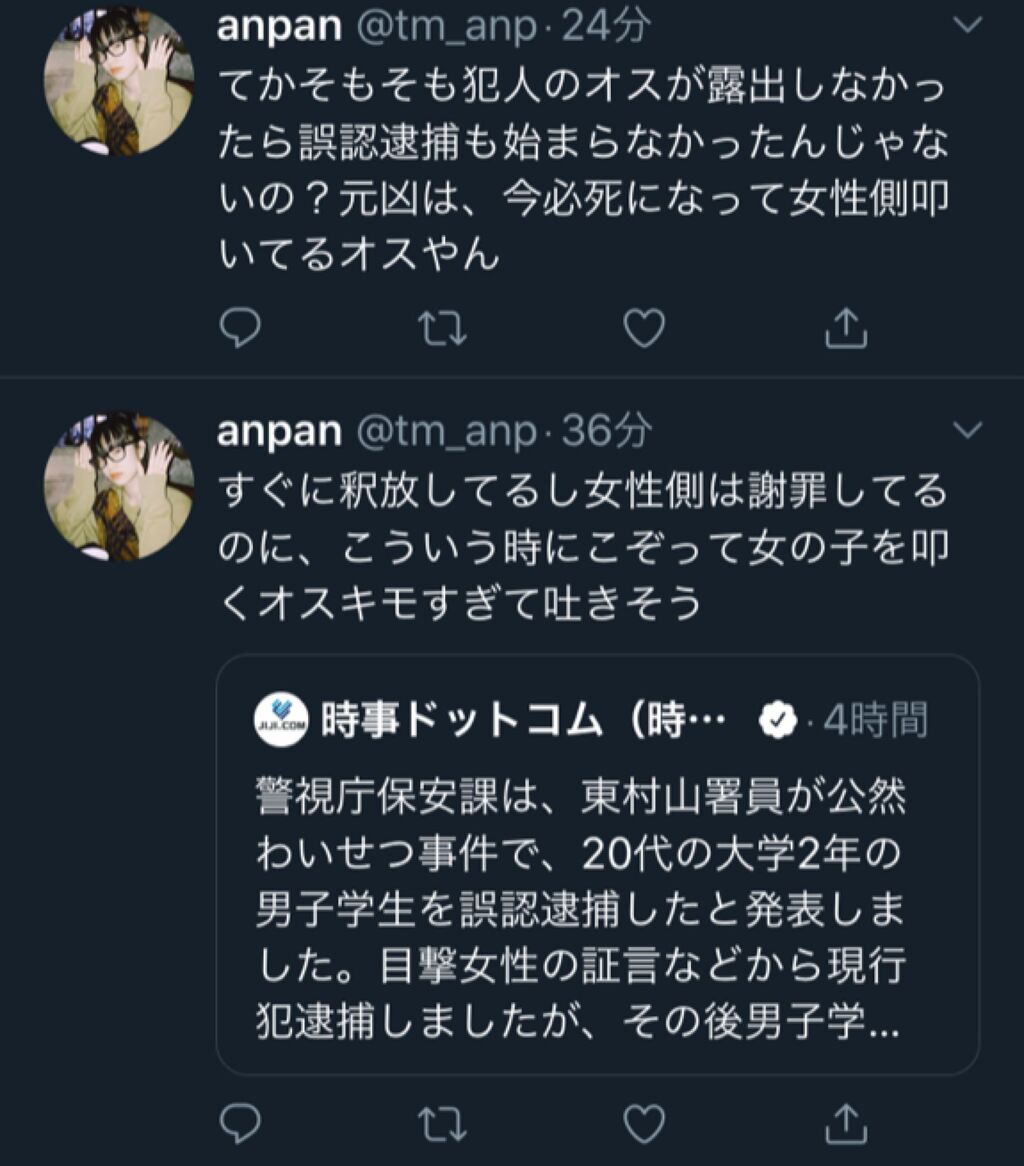 男子大学生は取り調べに応じている以上任意で協力してる立場だと言える、ツイッターの女と同じクラスまで知能を落とすのであれば馬鹿なメスが目が悪く確信を持てないのに犯罪者呼ばわりしたのが原因だろ。もみあげる名無し at 2020年02月09日 16:01 ID:P8gZ5T4x0 -