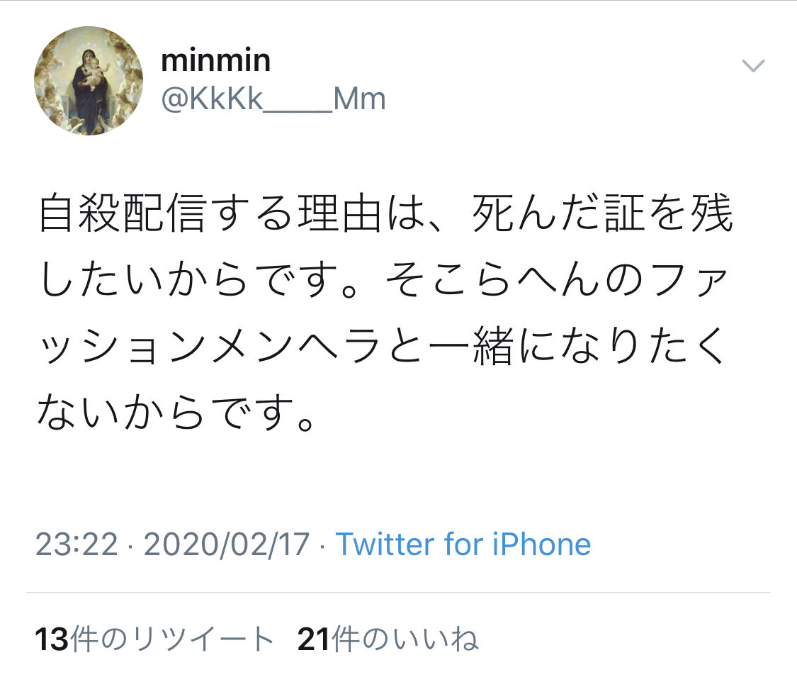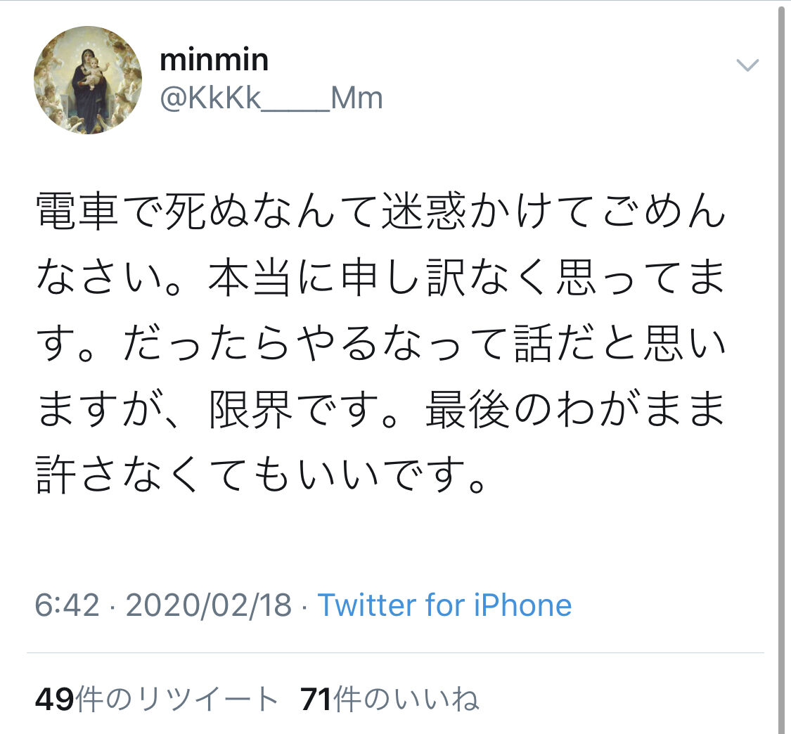 数ヶ月前に似た様にツイートして自殺したメンヘラいたろ。