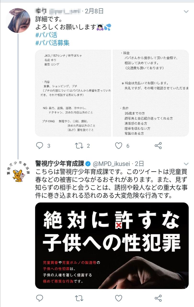 @xu_ml8cq こちらは警視庁少年育成課です。児童買春や児童ポルノの製造等の子供への性犯罪は、子供の人権を著しく侵害する極めて悪質な行為です。 https://t.co/9W4qaalguh