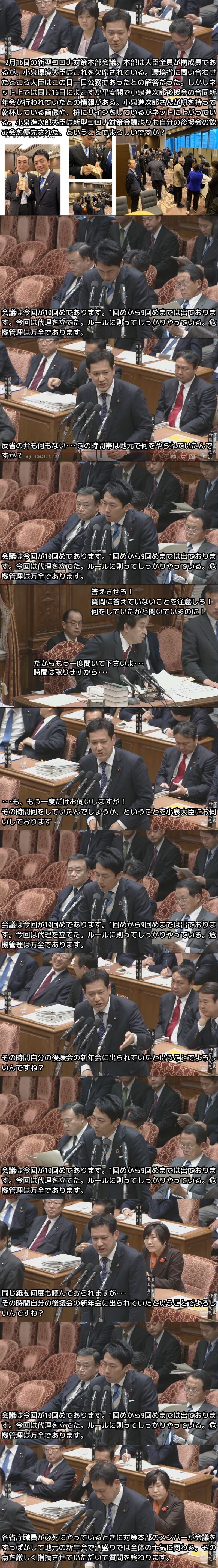 小泉進次郎環境相は20日の衆院予算委員会で、16日の新型コロナウイルス感染症対策本部の会合を欠席して地元で後援会の新年会に出席していた問題をめぐり、複雑な釈明をしながら「国民への謝罪」をかたくなに拒んだ。