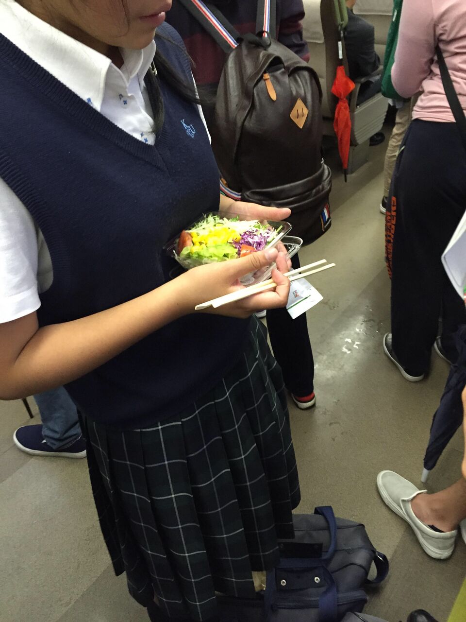 【悲報】女子高生さん、満員電車でサラダを食べてしまう