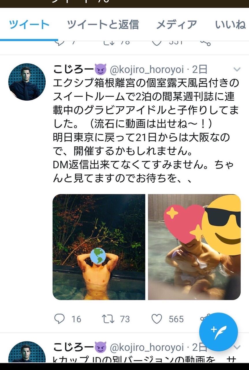 >>76のツイ元(@kojiro_horoyoi)は消えてるけど、コイツ新垢で未だグラビア系とか元芸能人とかをオフパコ斡旋してるっぽい(噂)