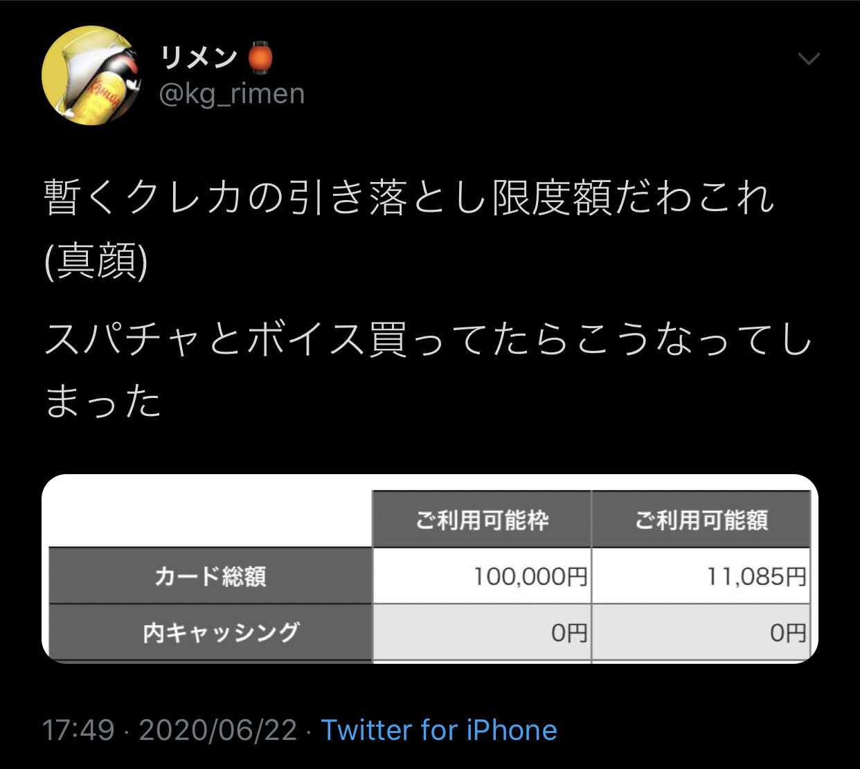 限度額10万のクレカなんてあるのな。もみあげる名無し at 2020年07月04日 23:21 ID:iJ9zJ6vd0