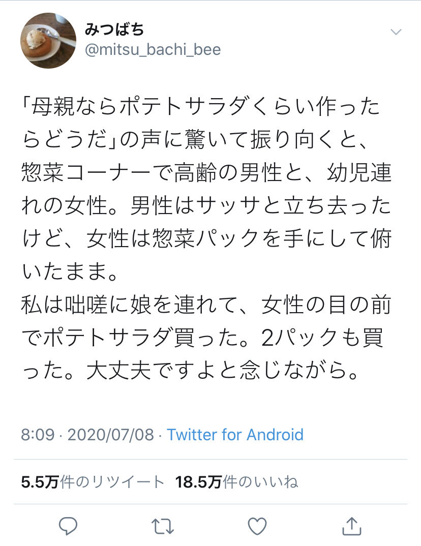 私は咄嗟に娘を連れて、女性の目の前でポテトサラダ買った。2パックも買った。大丈夫ですよと念じながら。」
