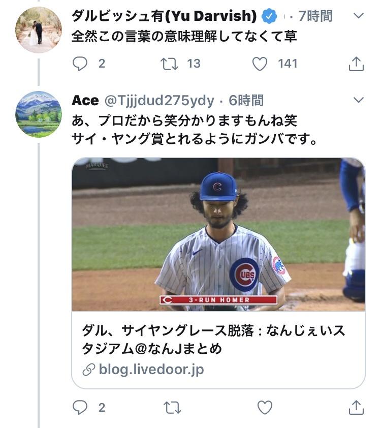 俺だったら…Twitterでもダルビッシュとたくさん話せてラッキーとか思っちゃうくらい雑魚だけどね…. at 2020年09月13日 23:11 ID:JeBvDjfn0 -