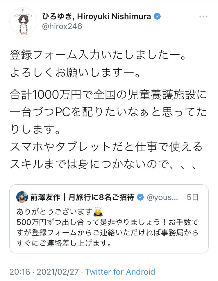 詳しくは前澤さんがなんか発信するそうですよい。もみあげる名無し at 2021年03月06日 17:21 ID:JdzFhNjo0 -