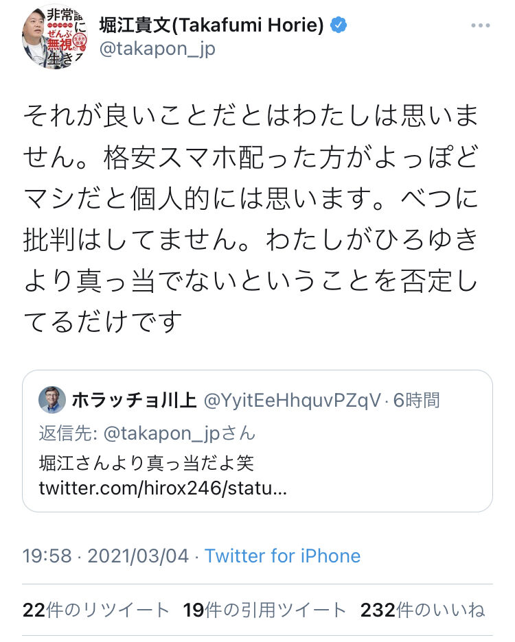同列に扱われがちだが堀江は犯罪者でひろゆきは性格悪いだけだから全然違うだろこいつらもみあげる名無し at 2021年03月05日 16:55 ID:TMSQZSMj0